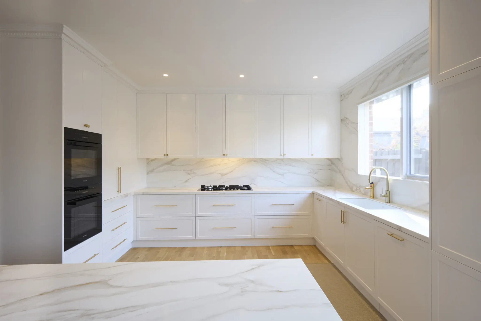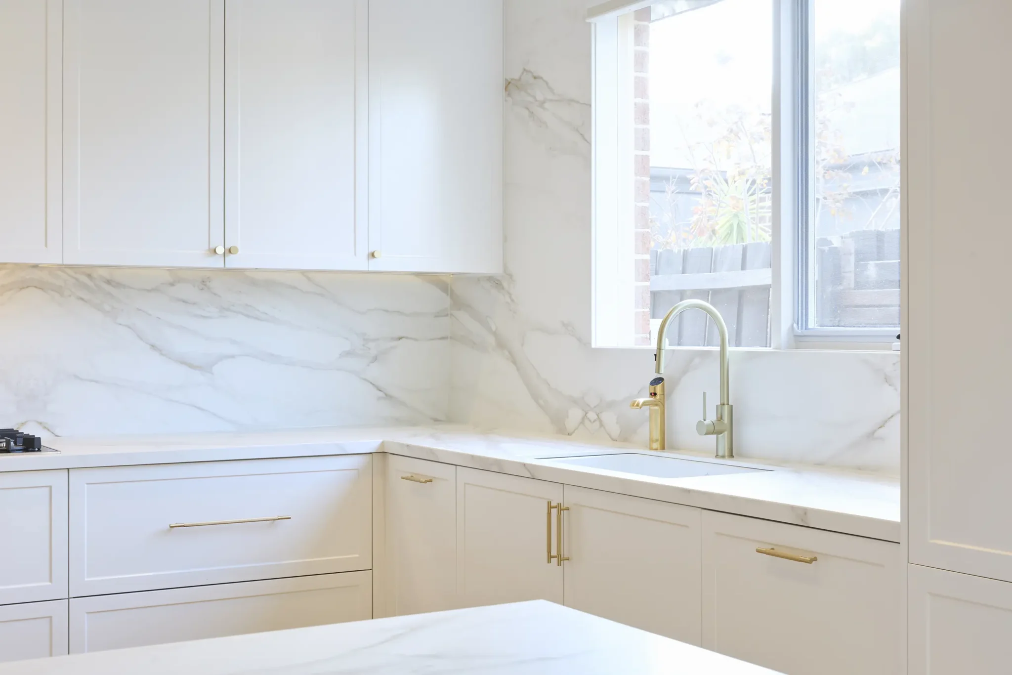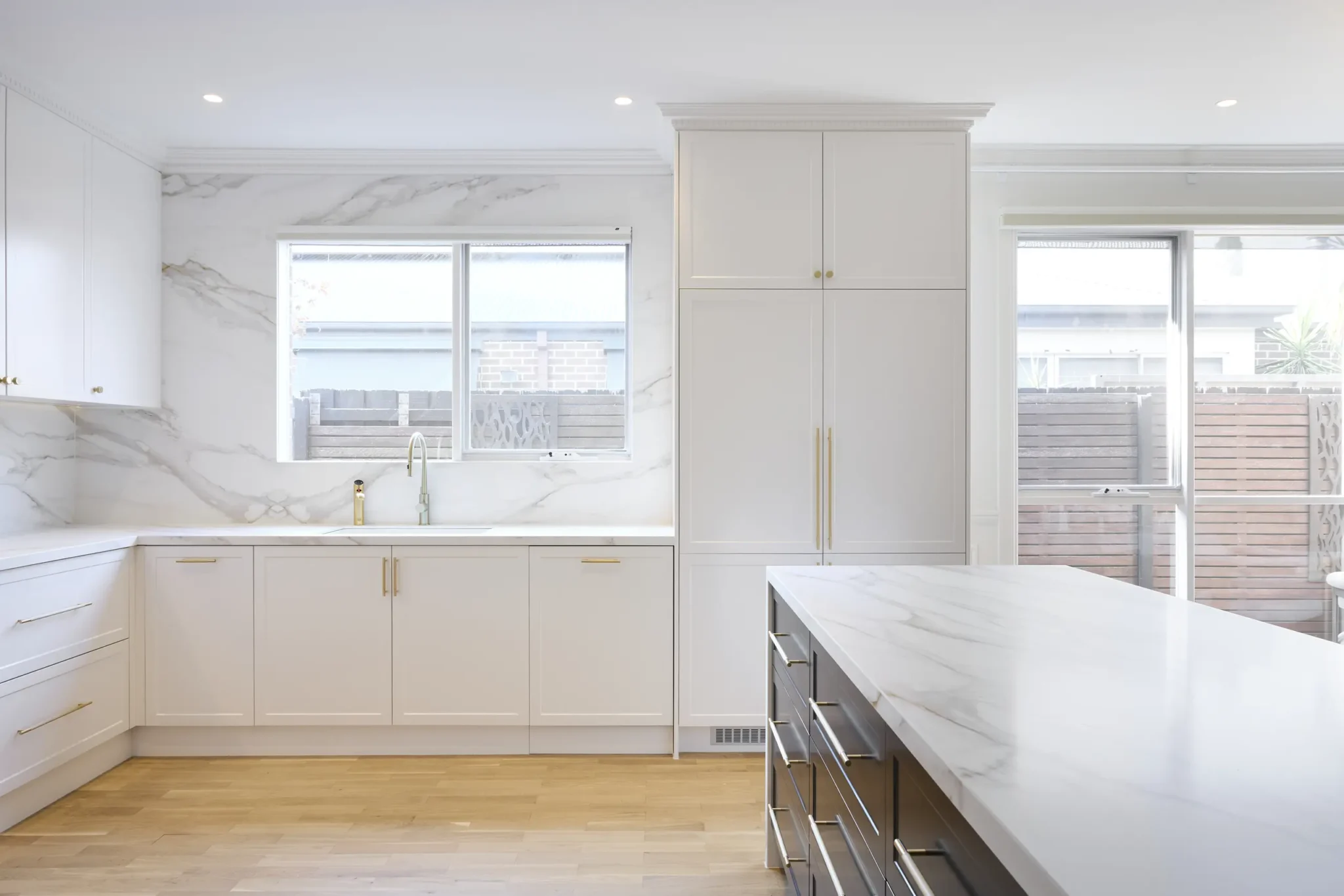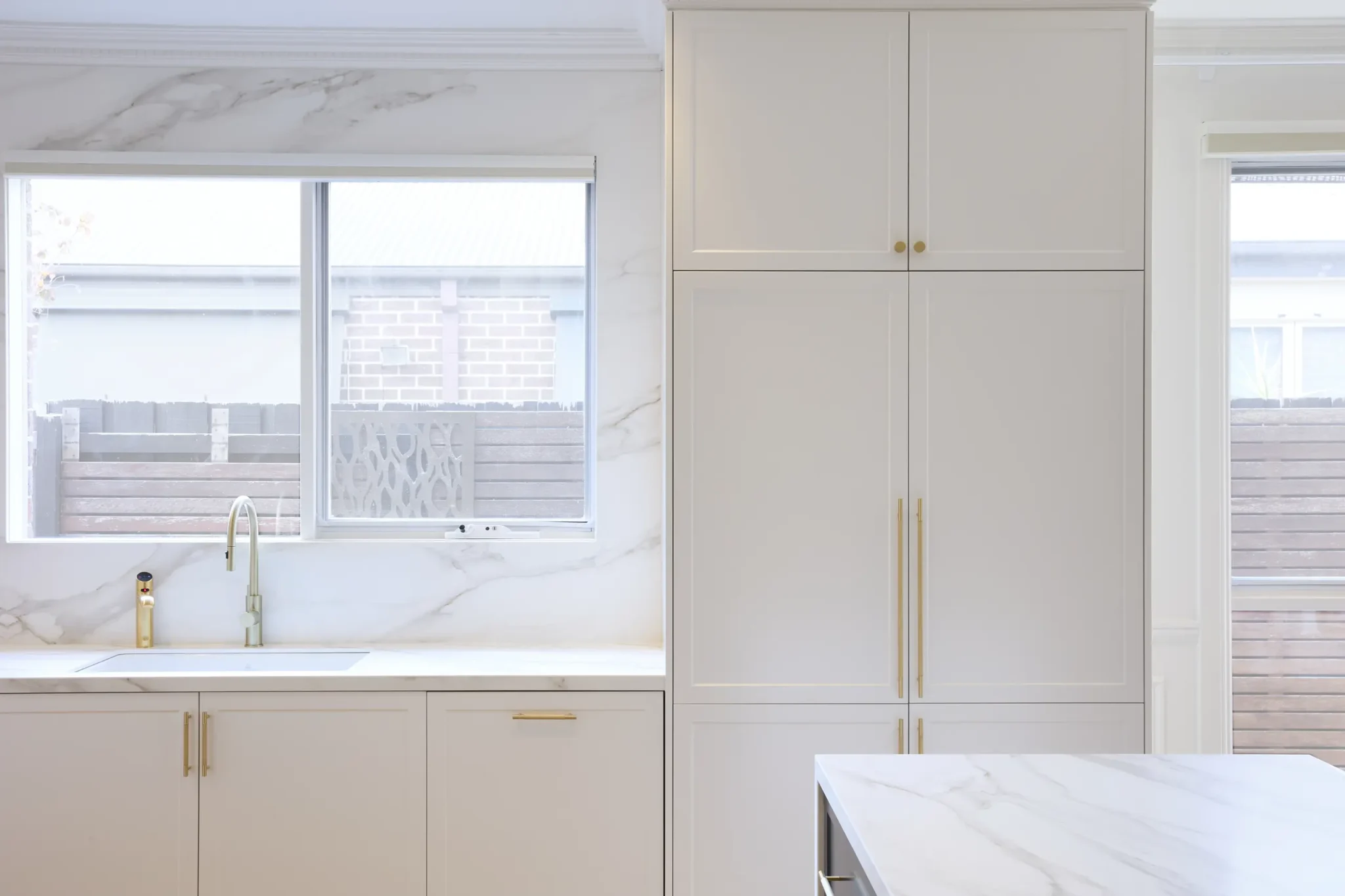 Jeanette’s kitchen renovation features custom 2PAC shaker profile cabinetry in Natural White with V-groove detailing, paired with a contrasting island in Dulux Tresspass. The benchtops and full-height splashback are finished in Dolce Whita stone, known for its soft veining. A handcrafted French fireclay sink and a Zip HydroTap—providing filtered, boiling, and chilled water—add functional elegance. Fully integrated appliances maintain a clean, seamless look, while the new open-plan layout improves natural light and flow. The palette blends whites, golds, and stone textures for a refined, modern finish.