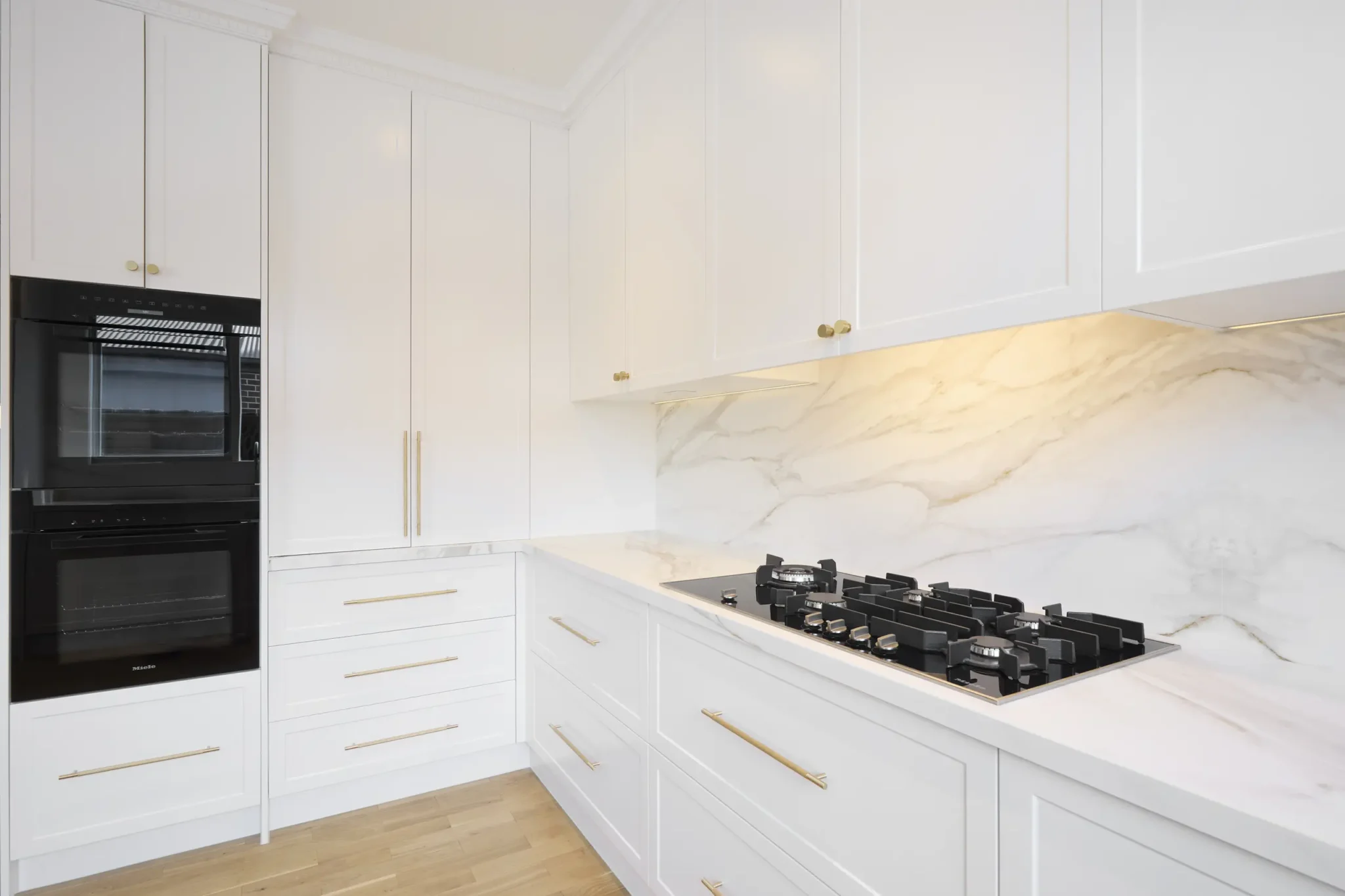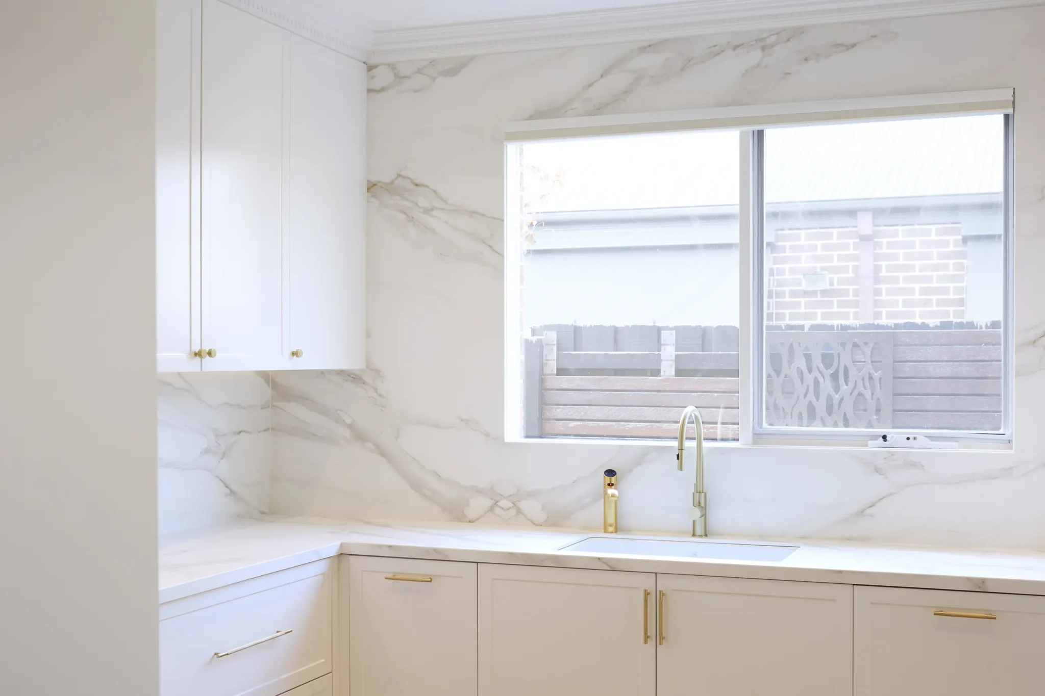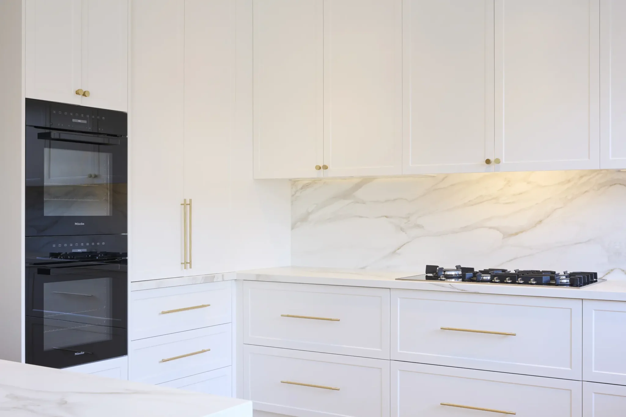 Jeanette’s kitchen renovation features custom 2PAC shaker profile cabinetry in Natural White with V-groove detailing, paired with a contrasting island in Dulux Tresspass. The benchtops and full-height splashback are finished in Dolce Whita stone, known for its soft veining. A handcrafted French fireclay sink and a Zip HydroTap—providing filtered, boiling, and chilled water—add functional elegance. Fully integrated appliances maintain a clean, seamless look, while the new open-plan layout improves natural light and flow. The palette blends whites, golds, and stone textures for a refined, modern finish.