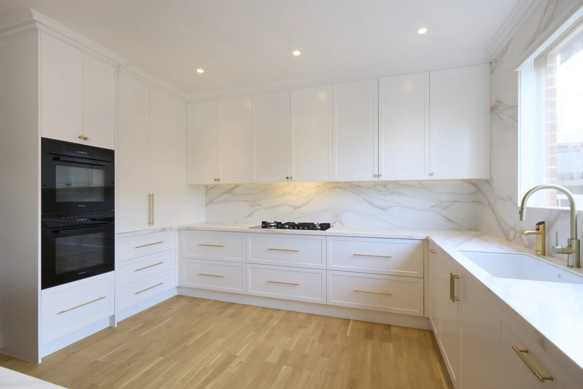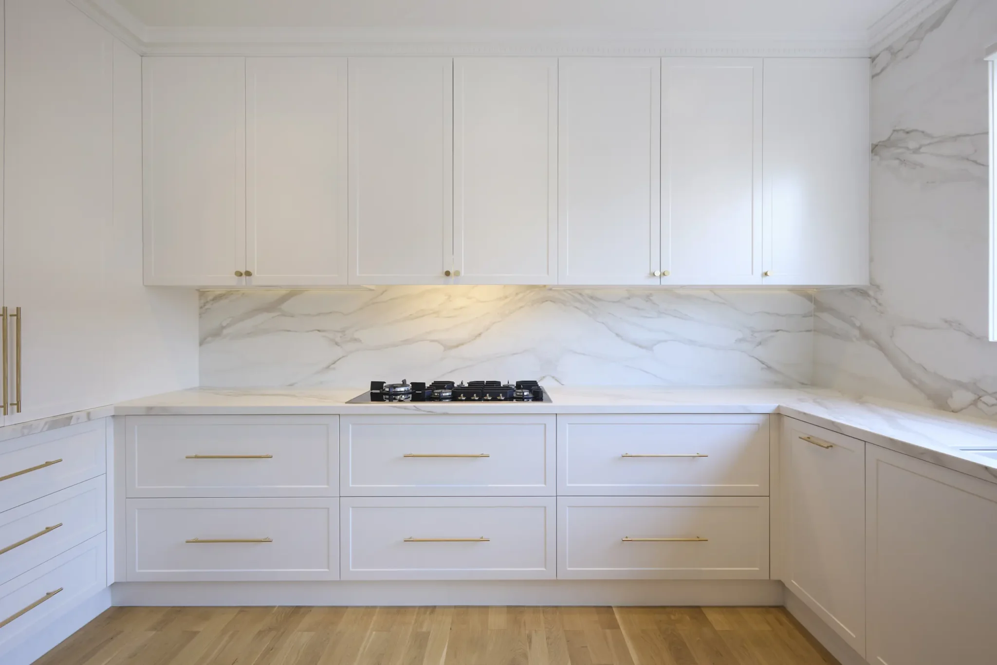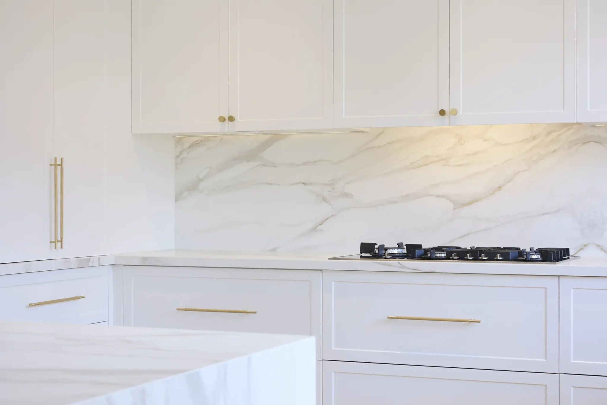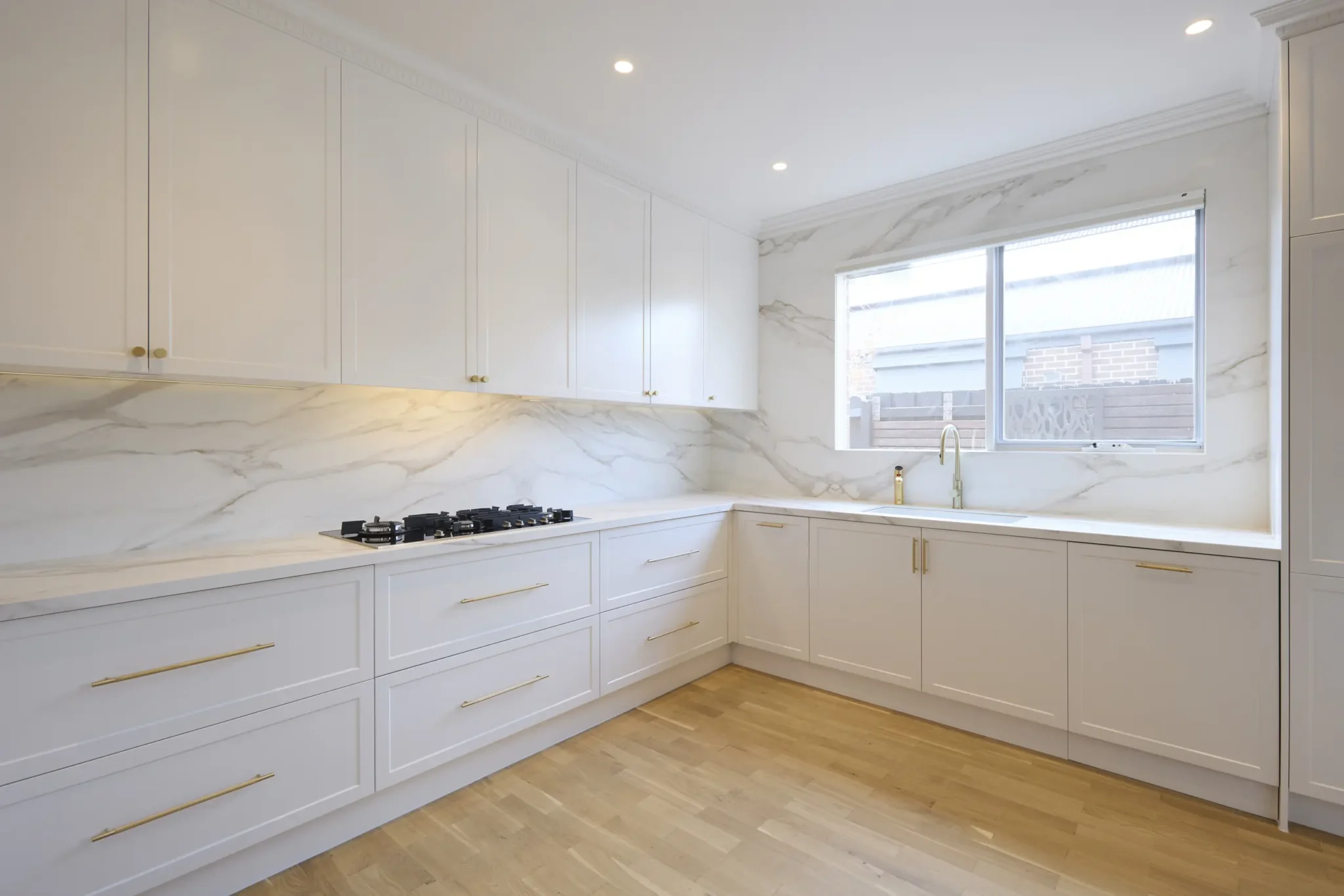 Jeanette’s kitchen renovation features custom 2PAC shaker profile cabinetry in Natural White with V-groove detailing, paired with a contrasting island in Dulux Tresspass. The benchtops and full-height splashback are finished in Dolce Whita stone, known for its soft veining. A handcrafted French fireclay sink and a Zip HydroTap—providing filtered, boiling, and chilled water—add functional elegance. Fully integrated appliances maintain a clean, seamless look, while the new open-plan layout improves natural light and flow. The palette blends whites, golds, and stone textures for a refined, modern finish.
