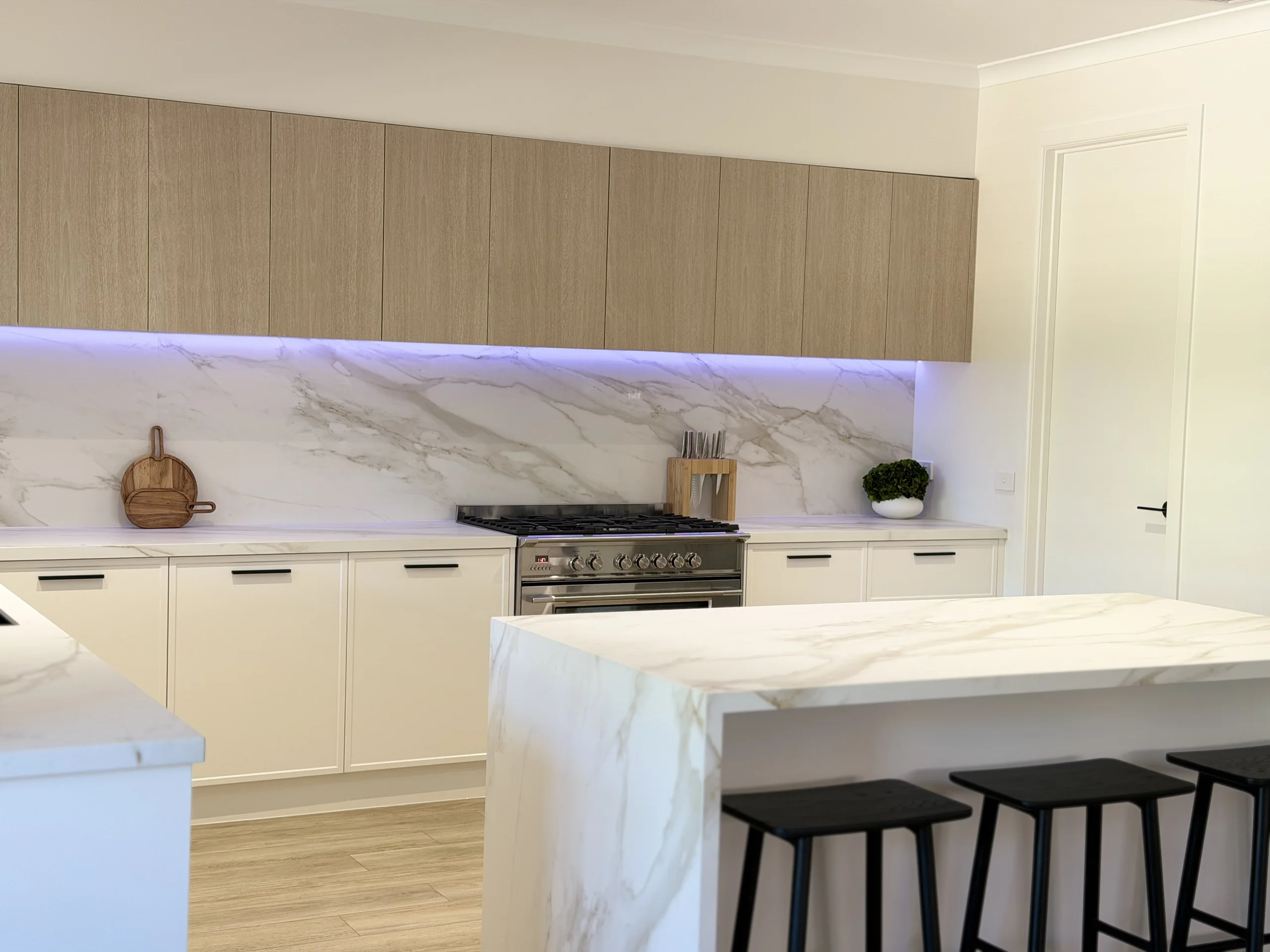 The transformation is stunning. We replaced the entire benchtop and added matching splashbacks that look absolutely incredible.