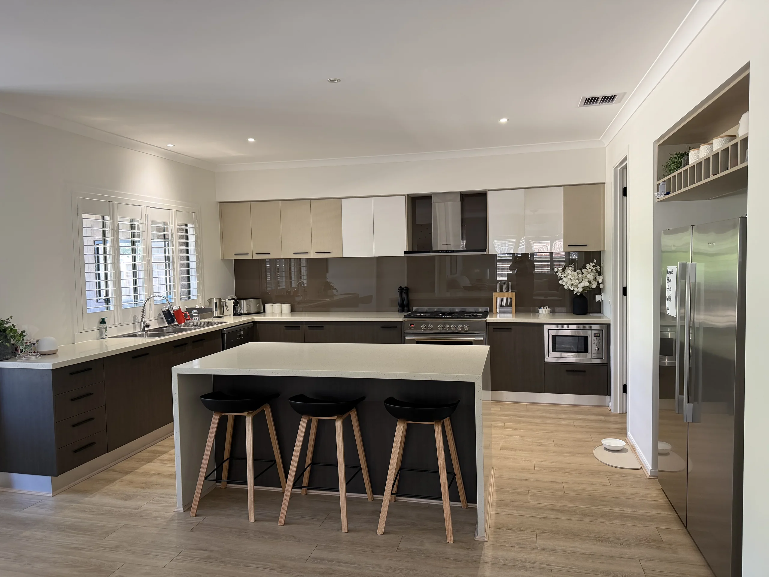 The pantry was completely rebuilt into a modern showpiece with glass doors and smooth pull‑out drawers — it’s honestly one of my favourite parts of the whole kitchen now.
