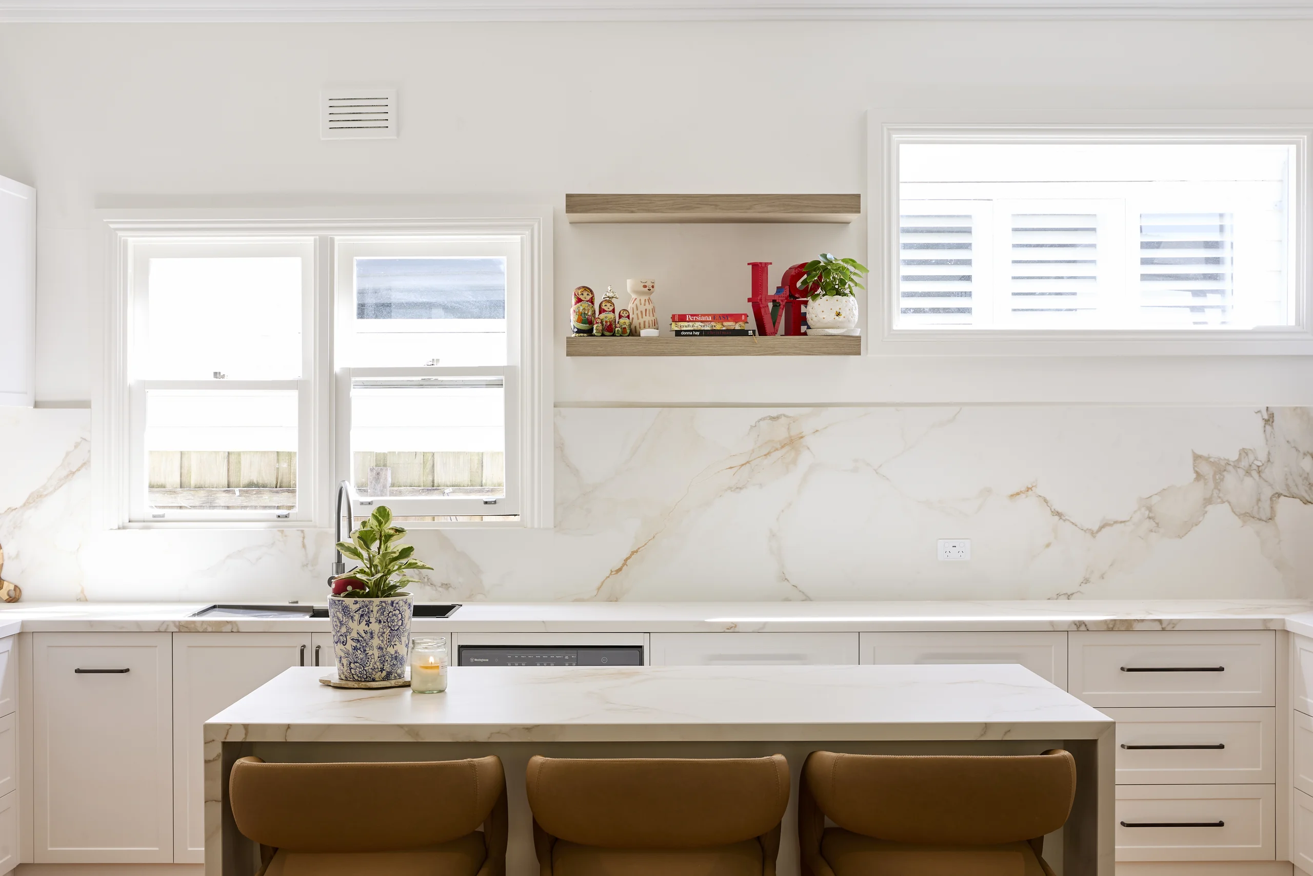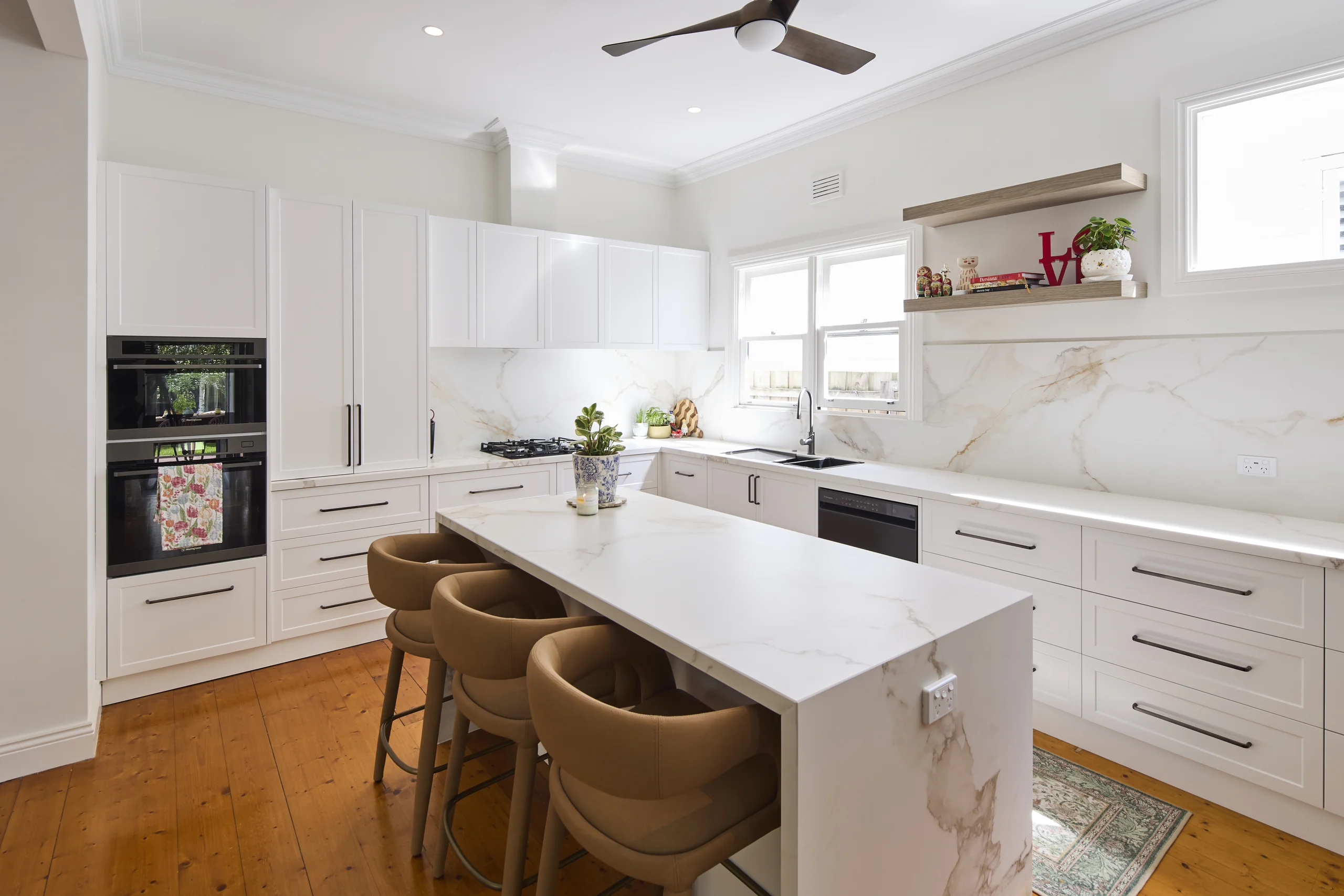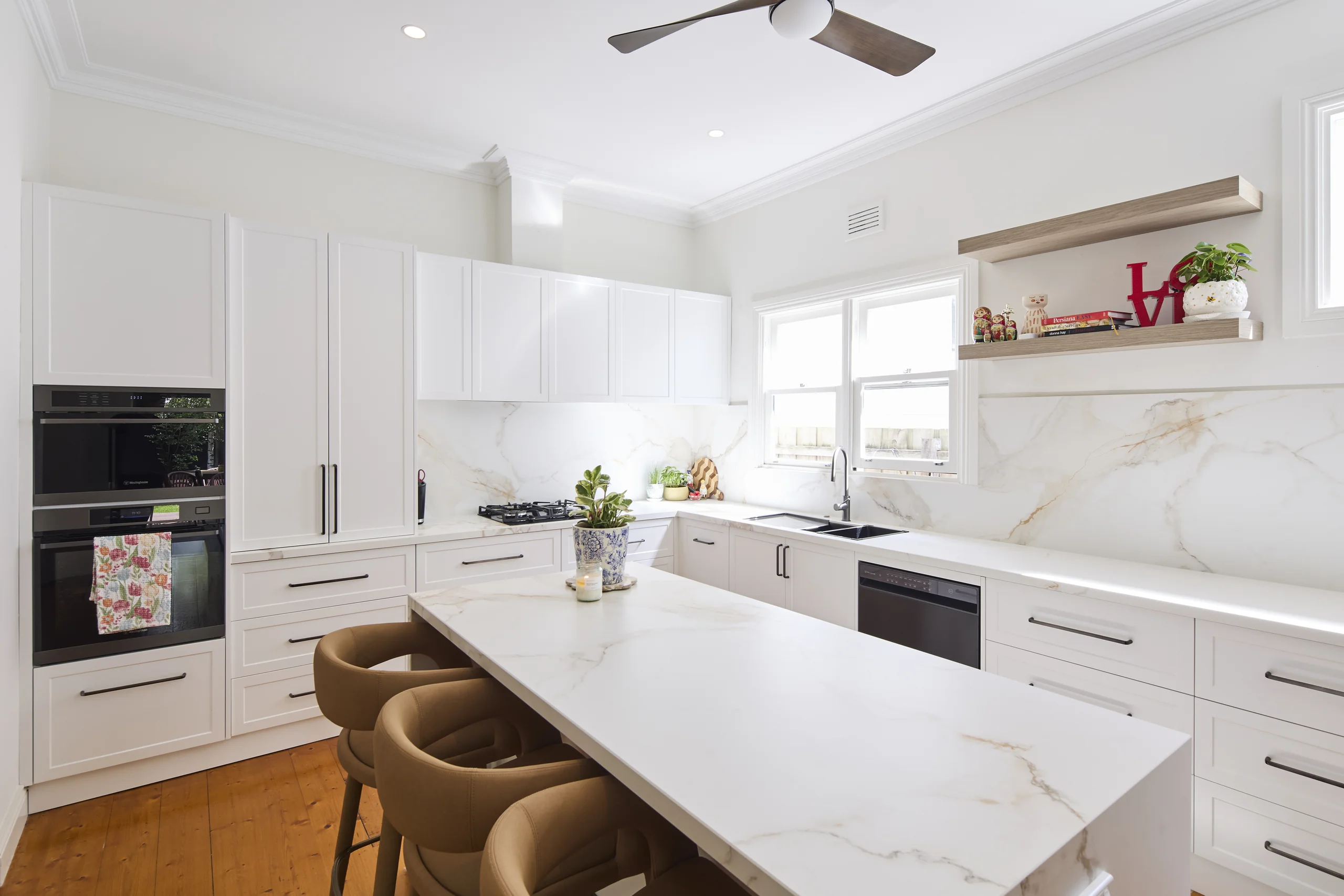 We recently completed a stunning full kitchen renovation for Sandra, transforming her outdated space into a modern, elegant haven. Utilizing high-quality 2pac shaker doors in Natural White for a timeless, clean aesthetic and Sahara benchtops for their durable, luxurious marble-like veining, we handled every aspect of the project with precision and expertise.